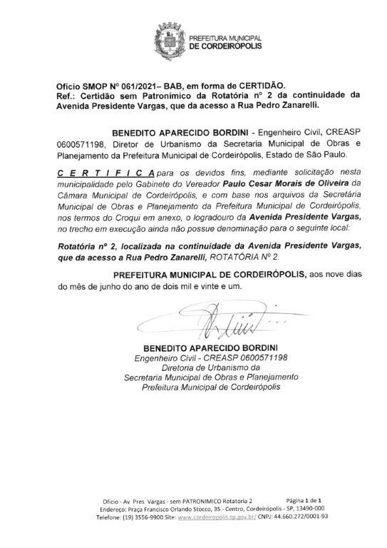 Ementa: Denomina de “Milton Schmidt” a rotatória nº 02, localizada na continuidade da Avenida Presidente Vargas, que da acesso a Rua Pedro Zanarelli, em Cordeirópolis SP.
